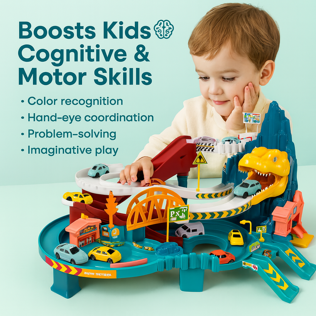 Turn playtime into a world of imagination with the DinoLoop™ Power Track Set — a thrilling combination of cars + dinosaurs + multi-level racing. The dynamic design keeps kids engaged while supporting meaningful developmental growth.