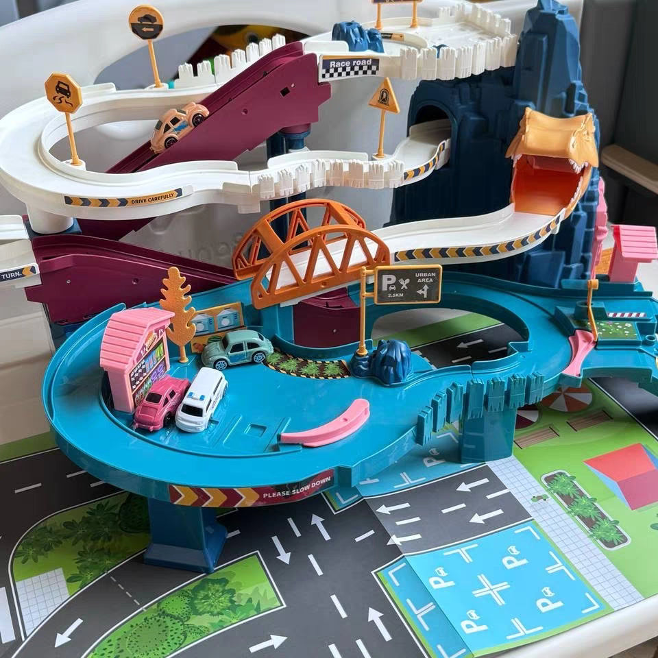 The full set measures 57 × 36 × 29 cm, making it a large, multi-level track that looks impressive and keeps kids engaged for long play sessions.